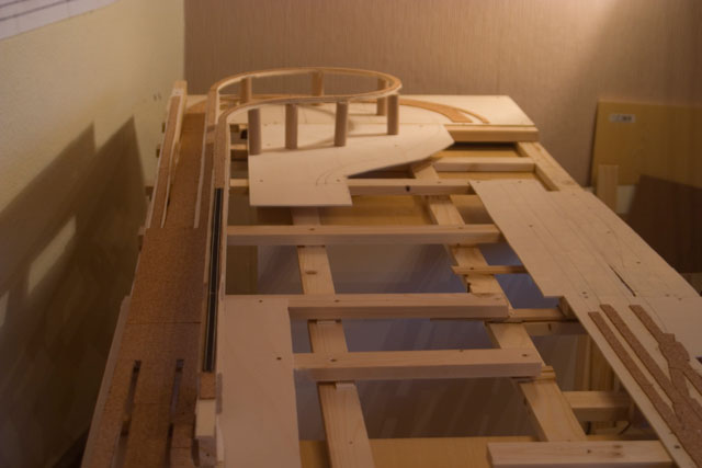 Die Trasse wurde mit einer Sperrholzunterlage (4 mm) durchgeführt. Dabei werden die entsprechenden Steigungs- und Gefällstrecken so moderat (2 %) wie möglich ausgeführt. Damit die Berggleise die nötige Höhe haben, um das Grundgleis zu queren, wird schon mit dem Grundgleis, im hinteren Teil, mit der Steigung begonnen.